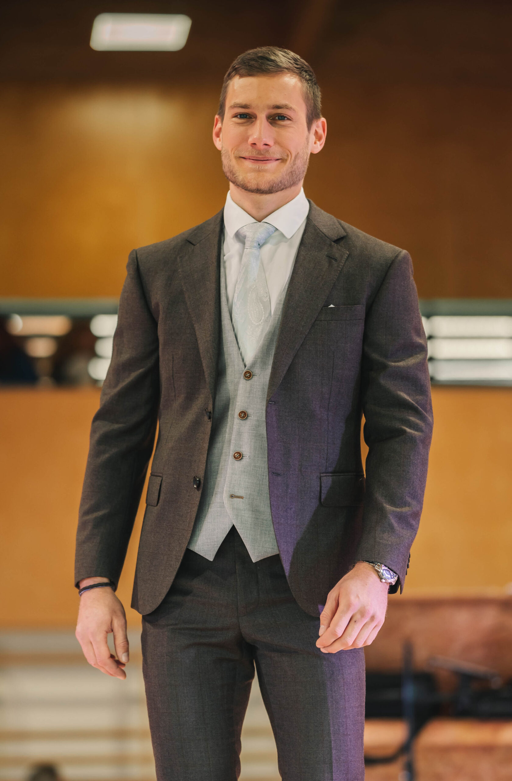 Nous confectionnons votre costume de mariage, tenue de cérémonie, smoking ou ensemble 3 pièces avec gilet selon vos désirs de coupe, style et dans le choix de votre tissu.