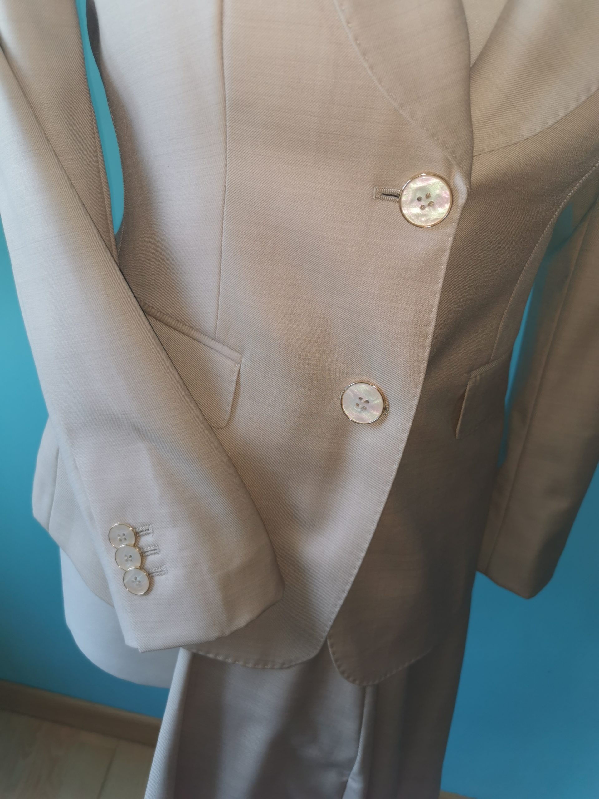 Le grammage du tissu permet de porter les tailleurs toute l’année et il s’agit de laine qui est thermorégulatrice.
